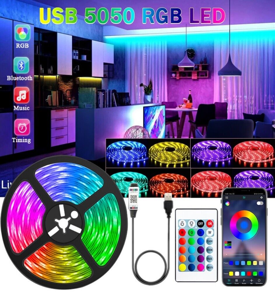 LED Strip Lights Bluetooth RGB 5050 1- 5m Colour Changing Tape TV Cabinet Kitchen