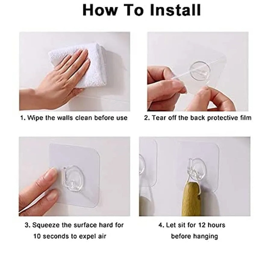 - Please use the adhesive hooks after 24 hours of installation. NO DRILL NEEDED, Just clean and dry the surface, then Peel off the back protection and stick it on the smooth surface.