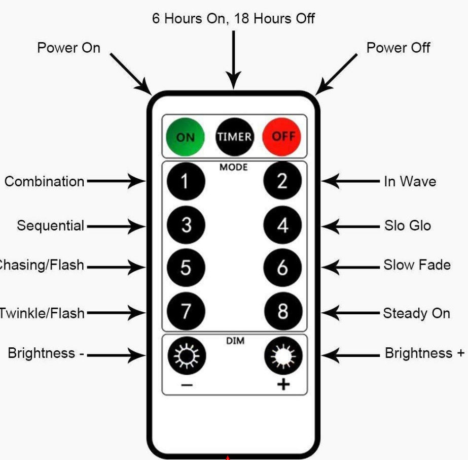 Use the 13 keys remote control for easy operation; Adjust brightness or select favourite modes between 8 lighting modes: Combination, In wave, Sequential, Slowly glow, Chasing/Flash, Slow fade, Twinkle/Flash, Steady On