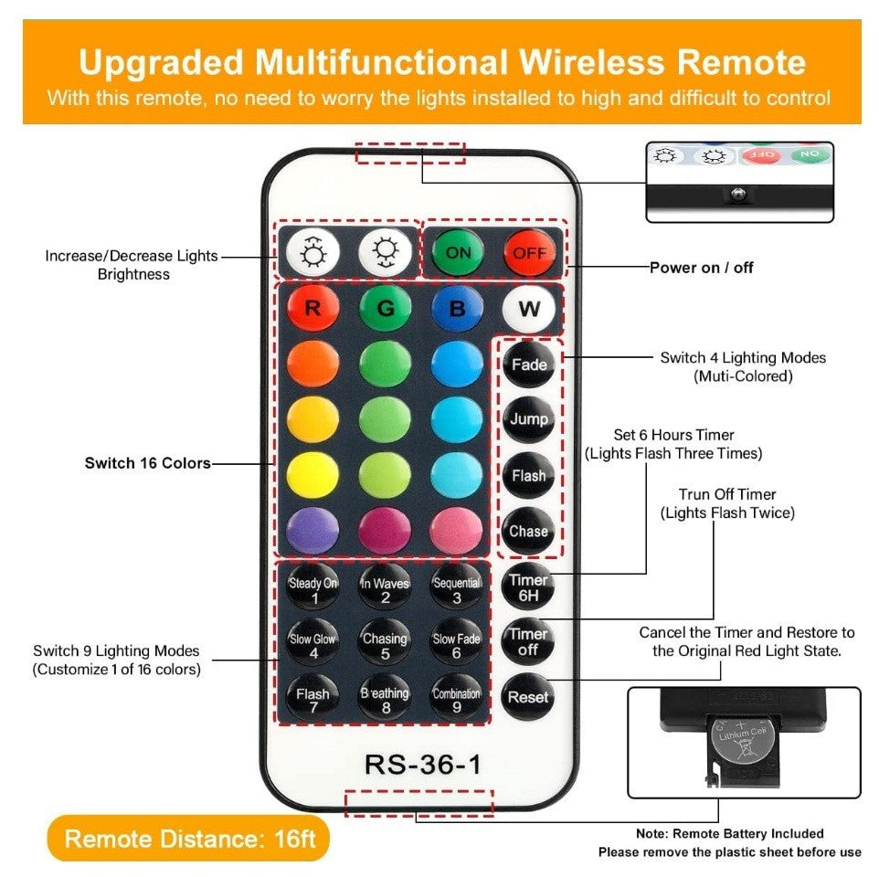 - Fairy Lights with Remote & Timer: Each of 16 single colors has 8 different flashing modes & 4 multi-color modes, a total of 132 modes. It comes with a 32-key intelligent remote, making it easy to select the color and lighting mode you want (such as Flash, Chase, Fade & Jump), adjust brightness levels, and set timer mode (6 on/18 off).